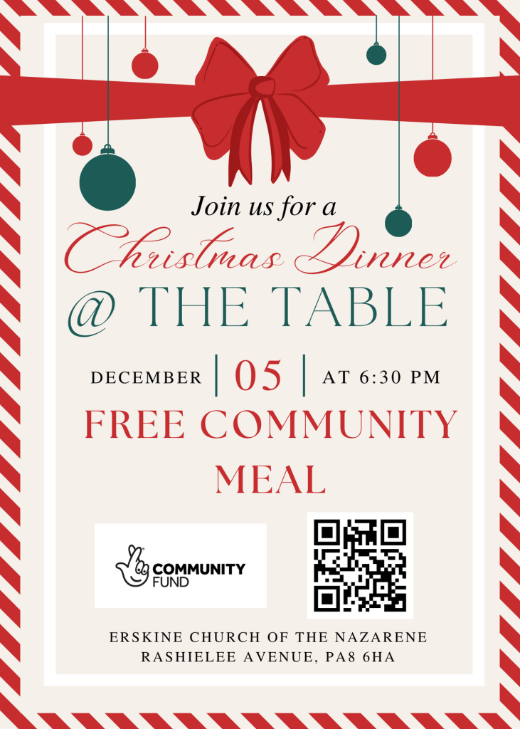 If you have any questions about the events above please speak with Pastor Jacob or Pastor Tori and they will point you in the right direction. These events are connected with Erskine Churches Together — for events happening within ECN please see the calendar towards the end. If you would like to volunteer to help out with this months Christmas meal please speak to Finlay MacKinnon. We are looking for someone willing to be Santa for some wee ones on these dates — please reach out to Pastor Tori if you would be up for it!